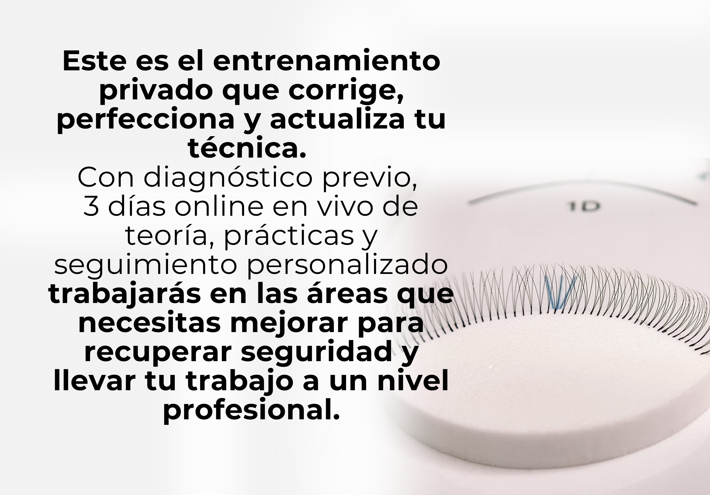Trabajarás paso a paso en tus puntos débiles —ya sea clásicas, volumen, abanicos, diseño, efectos, retención, redes sociales, ventas, o lo que tu necesites— con retroalimentación y temario totalmente personalizados.